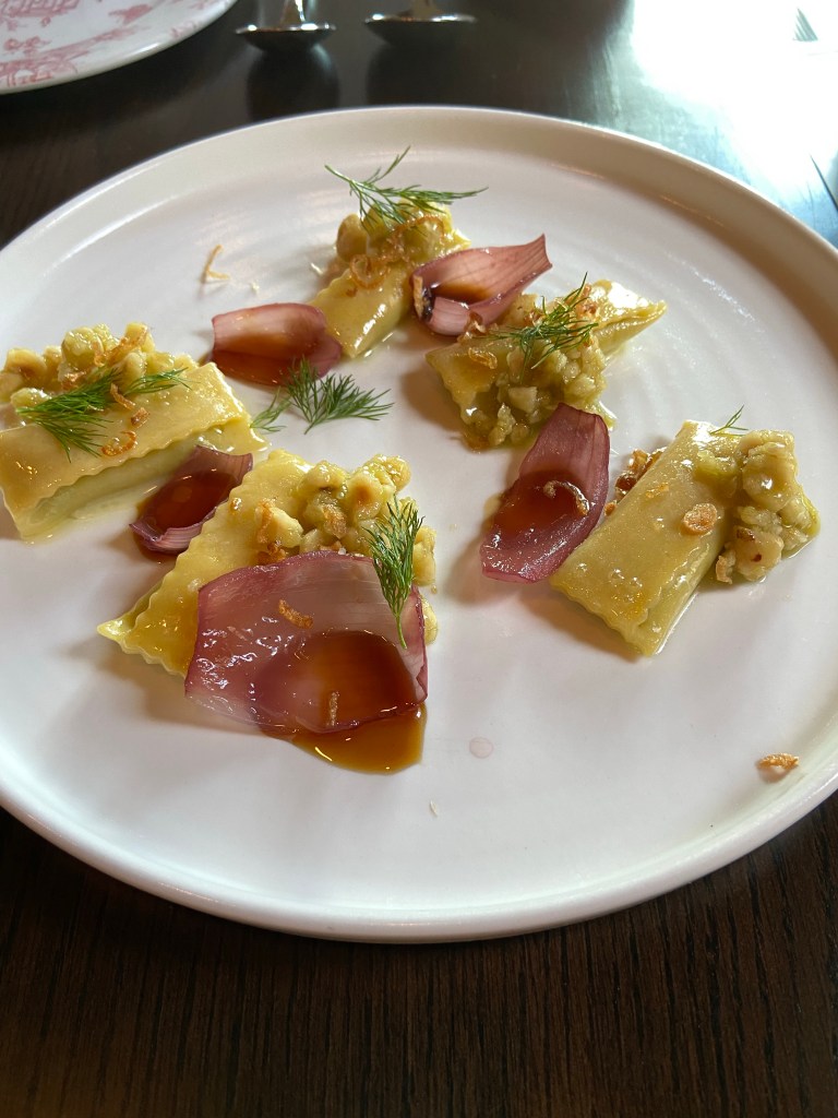 The onion agnolotti is a pasta dish with blistered springtime onions had a pretty plate presentation but the pasta itself was not soft enough.