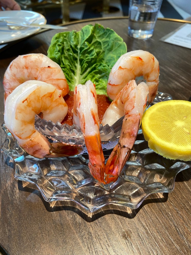 The shrimp cocktail came with five large chilled prawns sitting in a thick red cocktail sauce. It was a delicious way to start our meal.