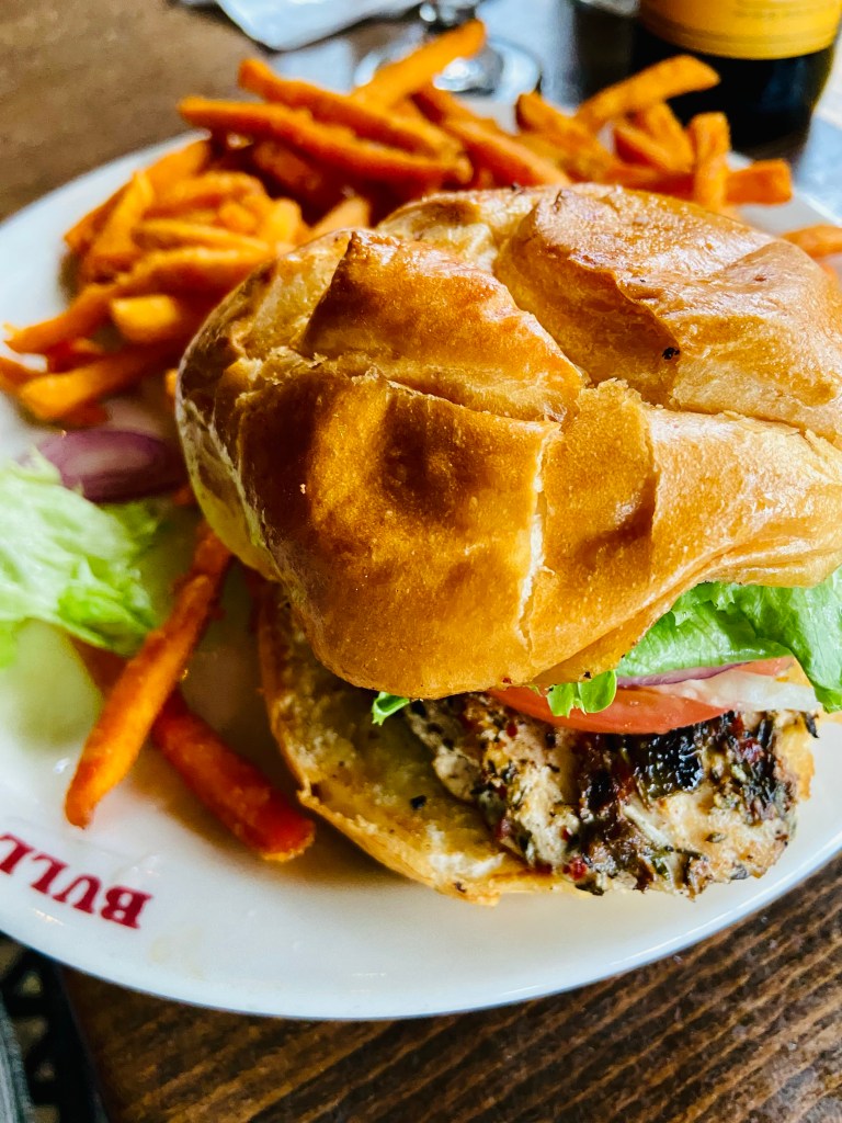 The legendary fish and chips and the grilled chicken burger with sweet potato fries were selected as our food choices.