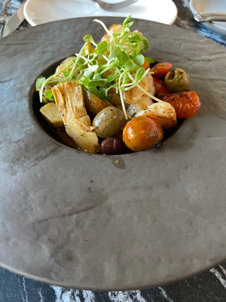 The grilled shrimp with artichokes, tomatoes, olives, onions, with a chili glaze is presented in a large bowl. The artichokes, tomatoes and grilled shrimp were excellent. The small tomatoes and shrimp set the tone for the evening.
