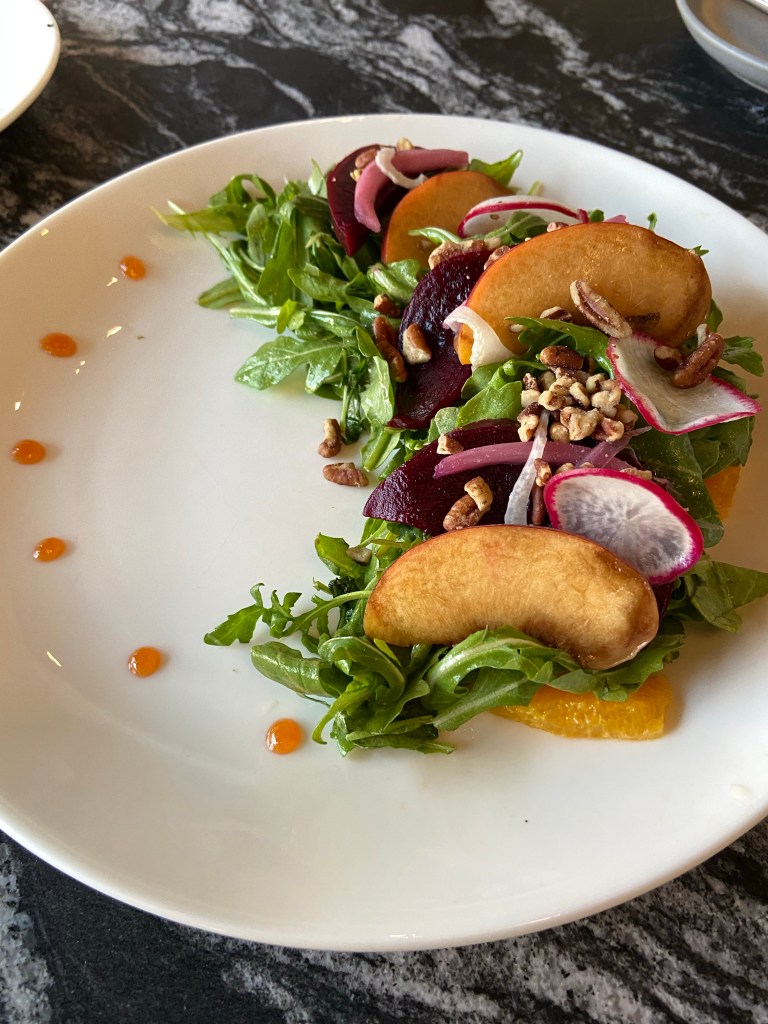 The last two dishes were disappointing. The beet and peach salad sounded too good to pass up. It was presented beautifully but lacked flavor. The peaches were not ripe enough and the beets had little flavor. The other side dish of green beans were over cooked as they were too mushy.