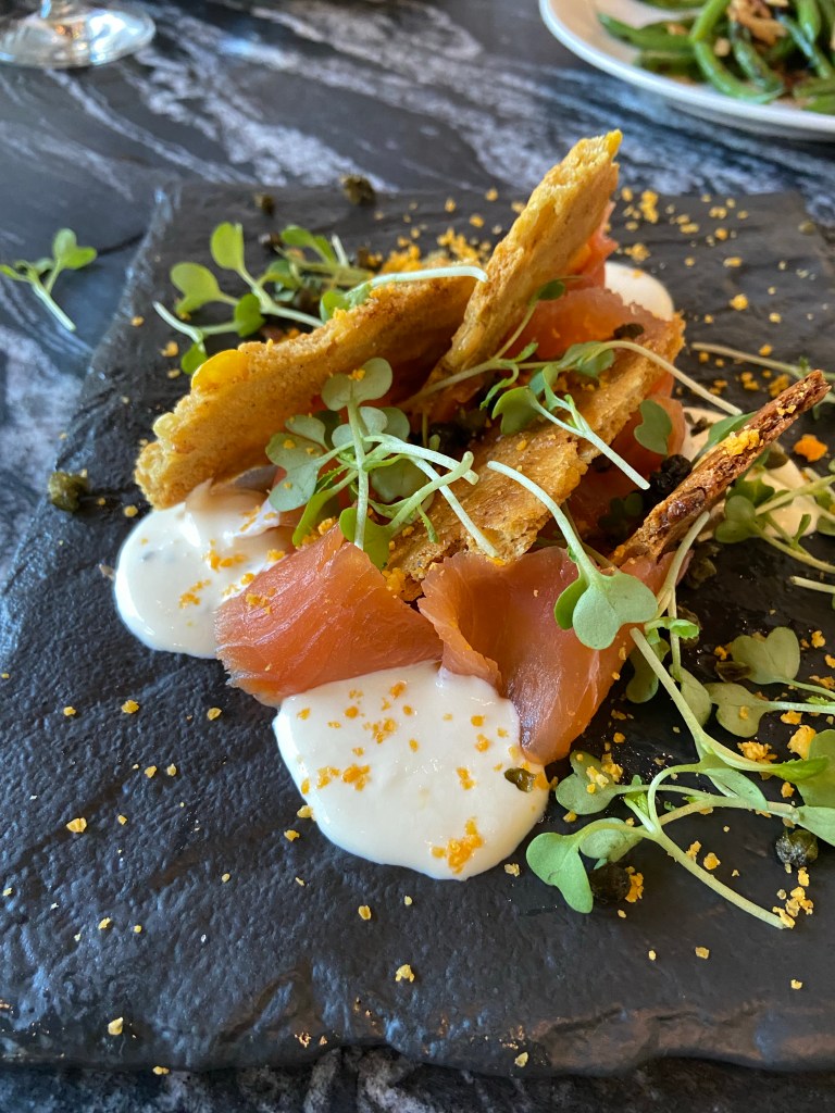 The smoked salmon is presented with cremé fraiche and homemade corn crackers had a very pretty presentation. We enjoyed the salmon with the light cheese taste.
