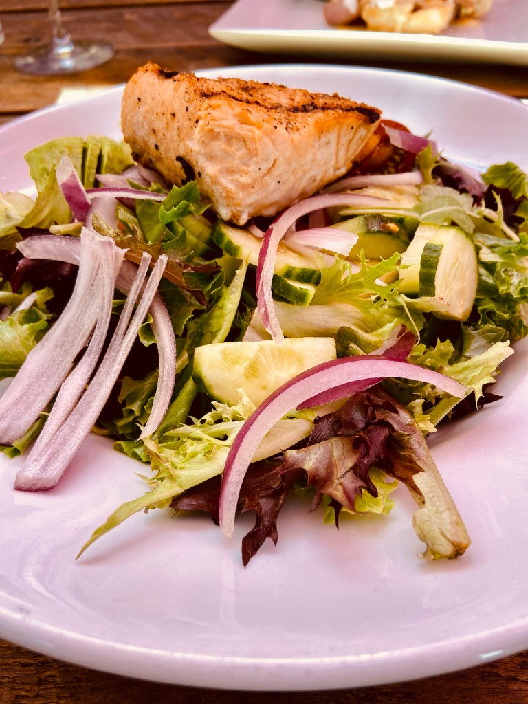 The grilled salmon salad had very flavorful salmon sitting on top of lots of lettuce and greens, onions, avocado, baby tomatoes, and cucumbers. The salmon itself was delicious. Sadly, it was presented without any dressing on the lettuce. We had to ask and the server admitted that it’s happened several times today.