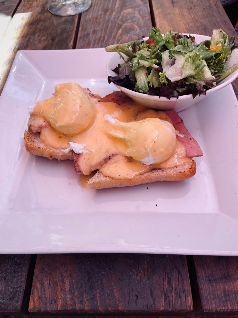 The eggs Benedict have two poached eggs and sliced ham sitting on ciabatta bread covered in hollandaise sauce. They tasted very good. The side of greens was disappointing at it as it was a very small amount with too little amount of dressing.