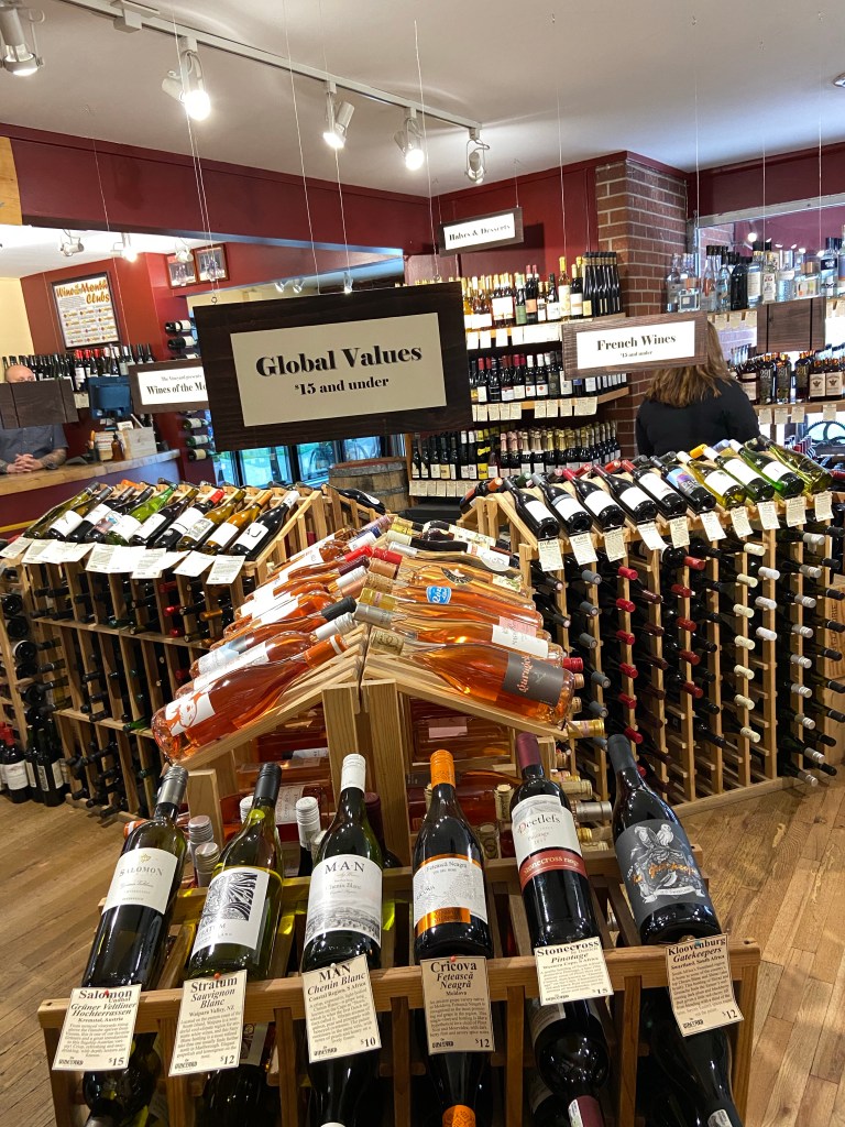 The Vineyard, which has been open since 1971, is a small store but with a basement full of wine shelved by its country of origin. Again, we handed the clerk the magazine article and asked if they could match any. They had one red wine, a Pinot noir, for only $12, same price as the magazine. We loved the basement and the signs under each wine explaining interesting facts such as a vineyard was over 100 years old. The clerk was not as energetic as the Mondo shop and delivery options were much more expensive .