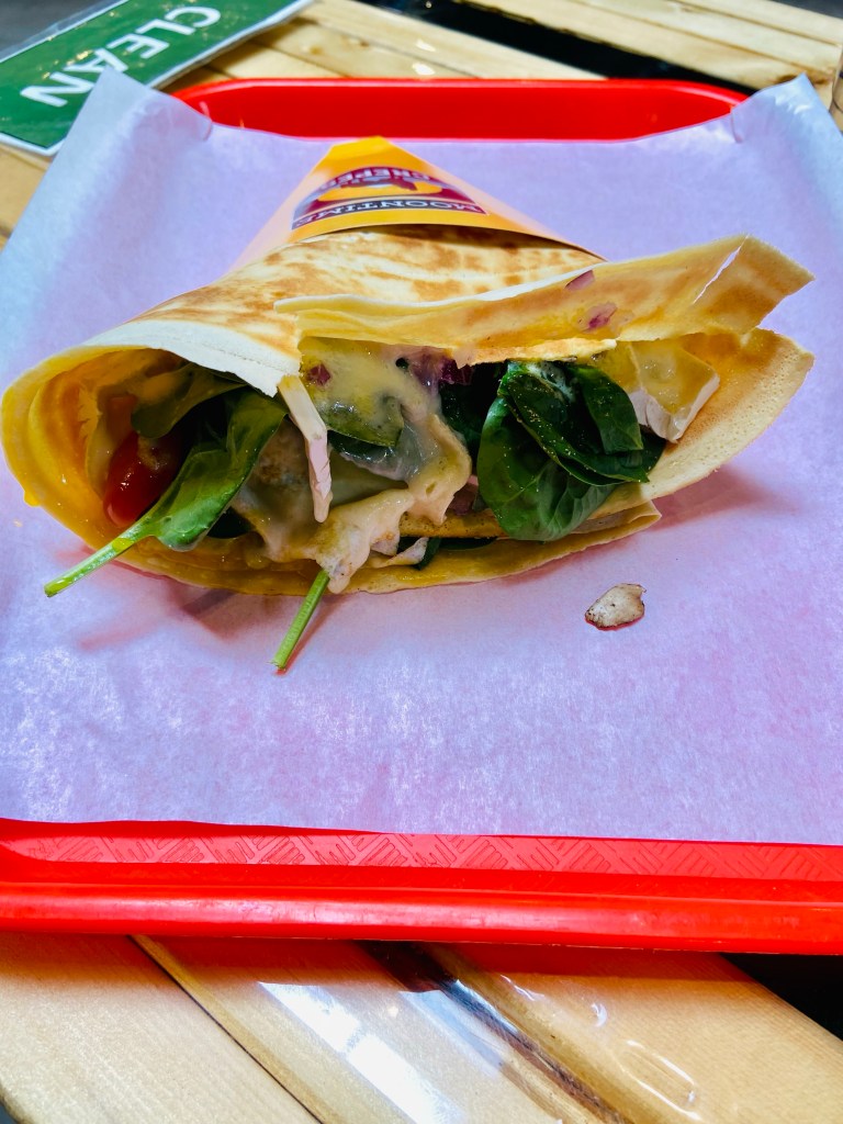 We had a Big Tasty crepe from Moontime Crepes. It was filled with goat cheese, bacon, grape tomatoes, spinach, and hollandaise sauce. It was very large and messy to eat because of the lots of extra sauce. The paper holder even can be unwrapped as you eat it! It was rated good.