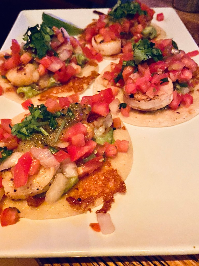 After the salad, the shrimp tacos which are four to a plate arrived. There is lots of tasty shrimp covered in salsa. It’s a good taco.