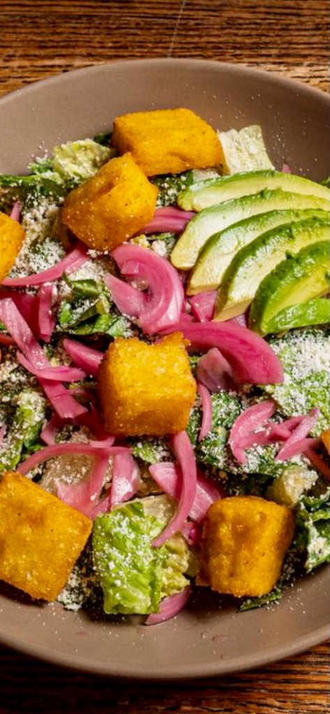 We started with the large green chili Caesar salad. The salad was large enough to be shared and it was filled with lettuce, pickled onions, and cubes of very warm polenta croutons. The salad was very good but the croutons were the different and an excellent ingredient.