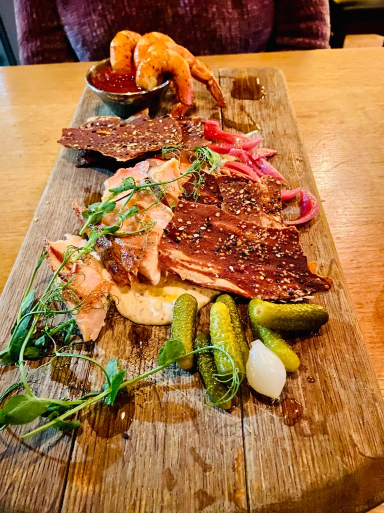 The seafood board has smoked salmon sitting on a mild sauce, pickled shrimp, small pickles and white onions, and crispy rice crackers. The shrimp and cocktail sauce were very good. The combination of little pickles and the mild-flavored sauce made the salmon.