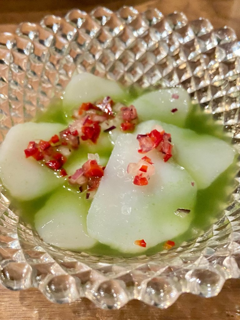 We started with oysters and finished with vegetables and everything in between. Eight oysters from Canada and the US were paired with scallops. With the extra finely sliced horseradish, the oysters and scallops were delicious. The scallops were topped with a little bit of chili.