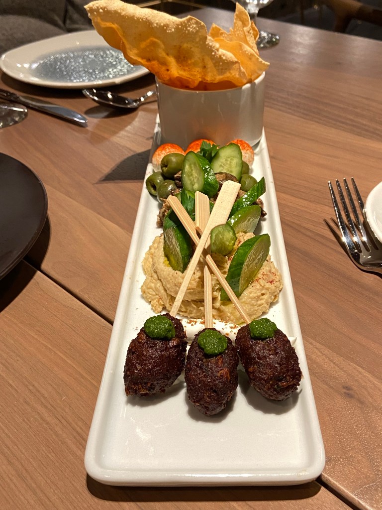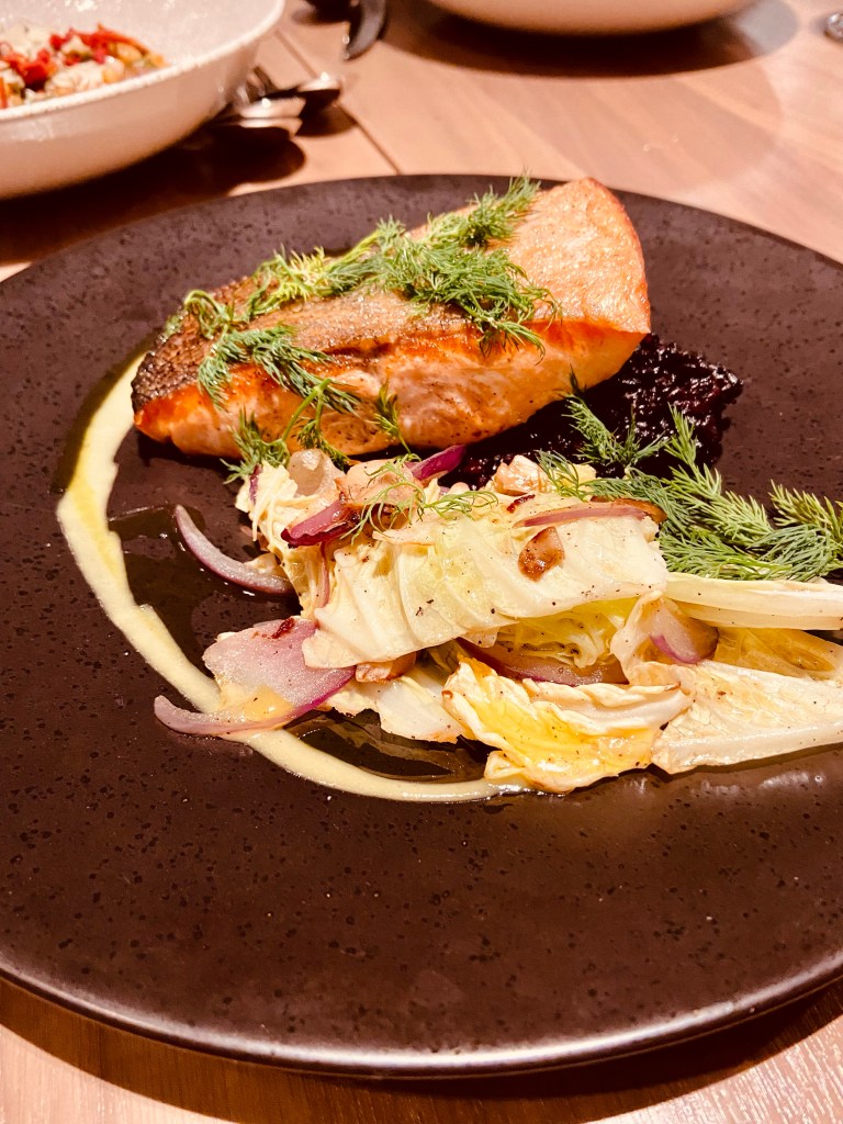 We started with appetizers dishes of trout ravigote and the mezze plate. The main dishes were the cavatelli, seared king salmon, and the beans and Brodo. We had to Google the menu with all the different languages to describe the food.