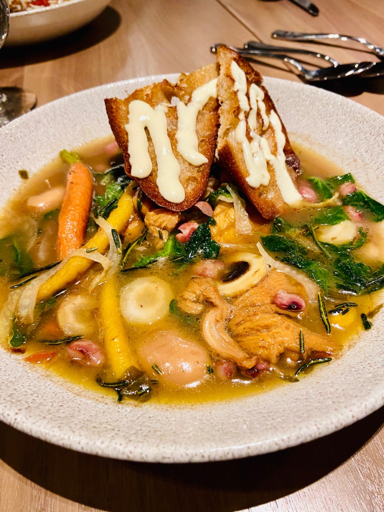 We finished with beans and brodo (broth). It’s a large size bowl filled with mushrooms, chanterelles, large Gordo beans, and lots of vegetables. Sitting on top was two excellent pieces of sourdough bread toast with aioli. The bread was delicious! A great entrée for a cold winter evening.