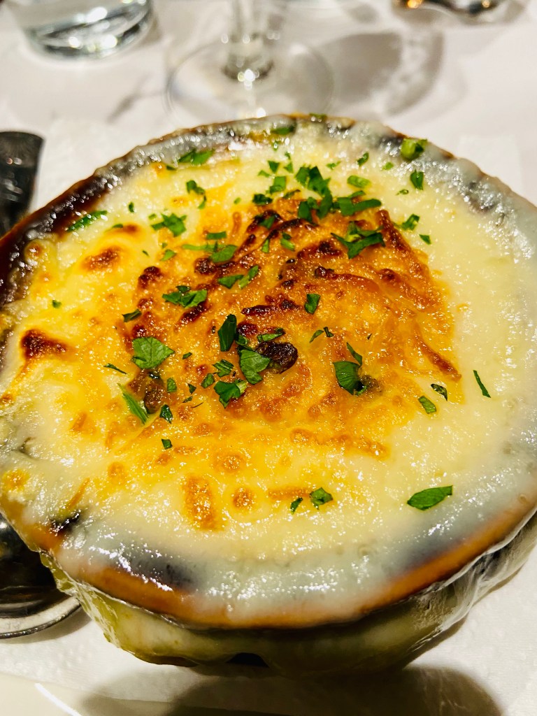 We ordered the mussels in the spicy tomato broth, onion soup with cheese, and the vegetarian dish of the night.