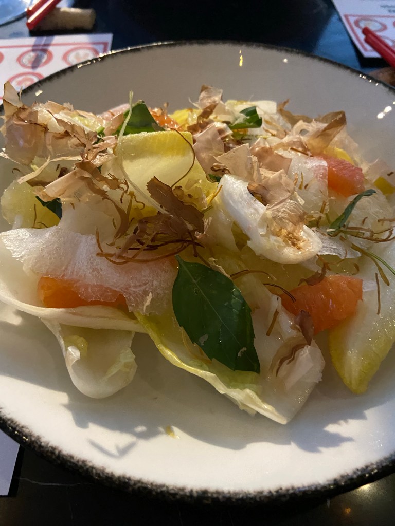 Endive salad with citrus and gourds was dressed with a fish vinaigrette and were finely sliced with a crunchy texture. The endive and citrus was the hit.