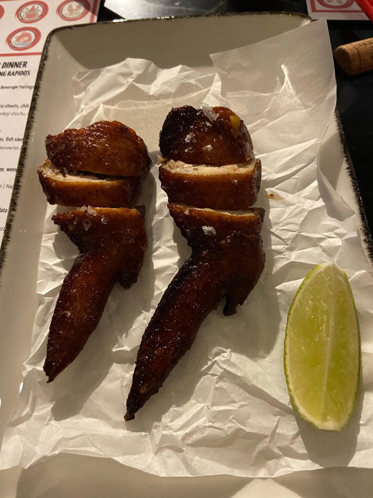 The tasting menu was comprised of the following: shrimp, endive salad, chicken wings, noodles, pork belly, and panna cotta.