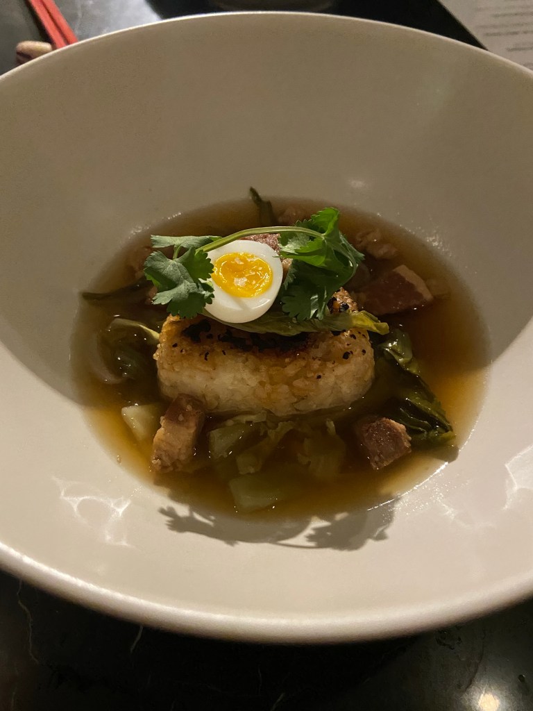The fifth dish was pork belly presented with a small quail egg and a large square of rice and pickled greens sitting in a warm broth. The greens and rice were tops.