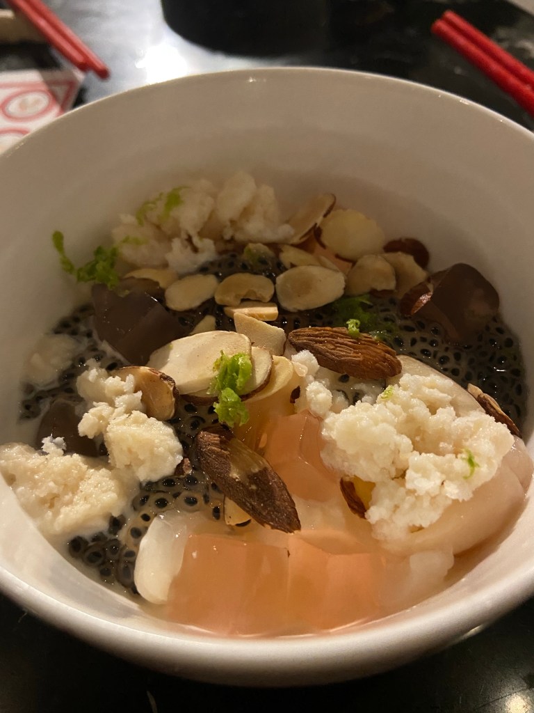 Dessert was sweet and panna cotta with sliced almonds, lychee fruit, and longan fruit. The fruit and almonds added a new taste for dessert as it wasn’t even sweet but so good.