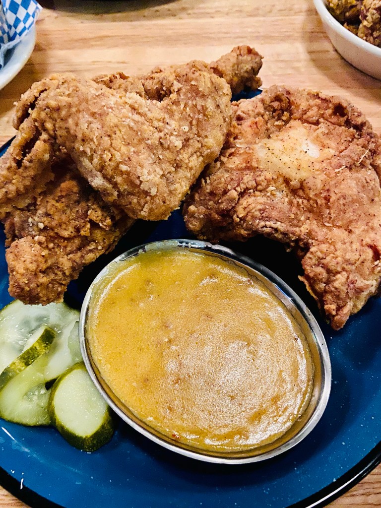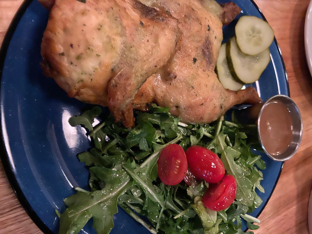 The main dish was a fried one half chicken with pickles and gravy. It was a very large sized dish. The chicken was southern style, crunchy on the outside but soft and great flavor inside. The other dinner enjoyed the roasted chicken with a side of arugula salad.
