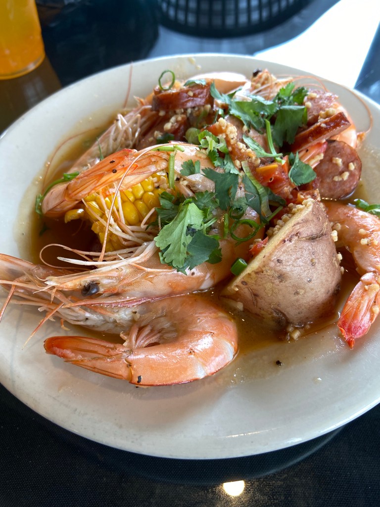 I enjoyed the “bowl” of the whole shrimp with corn, potatoes, and sausage. Although it’s extremely messy to eat as you have to clean the shrimp, it was delicious! The sauce was mild and not too spicy.