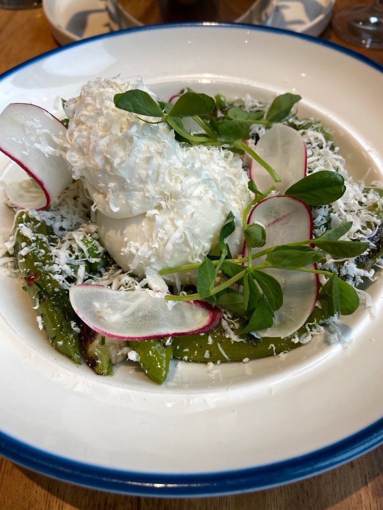 Brasserie Brixton is a small space with a large bar. We started with a glass of wine and one of my table guests had a different taste. No problem, as the server suggested a different wine and brought out a new glass of wine at no extra charge. One of us enjoyed the classic French onion soup and a bowl of French fries. Both given good marks. I started with the Burrata cheese salad. The cheese is plated on a bed of grilled snap peas. Definitely an excellent presentation and taste. We finished with a small green salad and the salmon and pistachios. A good combination of fish and with a little crunch.