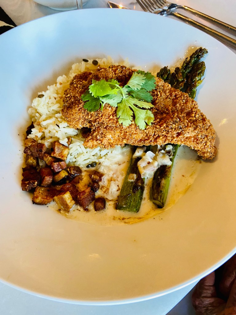 The other diner had the entree sized chicken Kiev with rice and asparagus. The chicken was soft, tender, and still warm when presented.