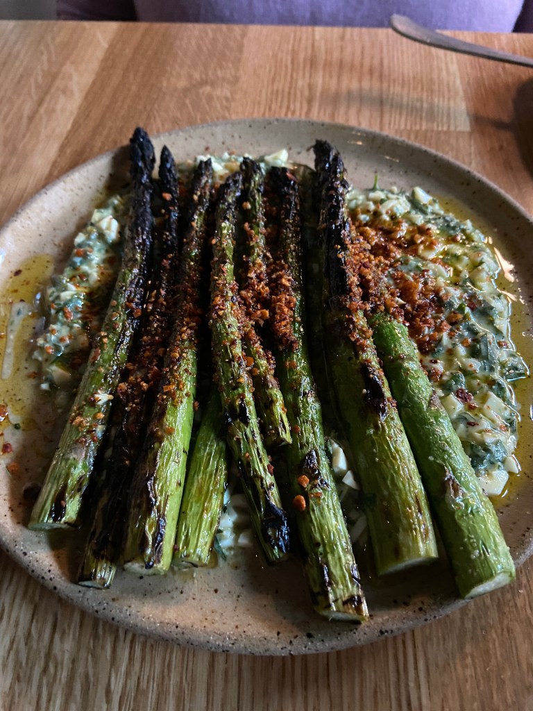 The grilled asparagus was sitting on a gribiche sauce which is egg, cucumbers, and parsley with added garlic. Very good springtime asparagus!