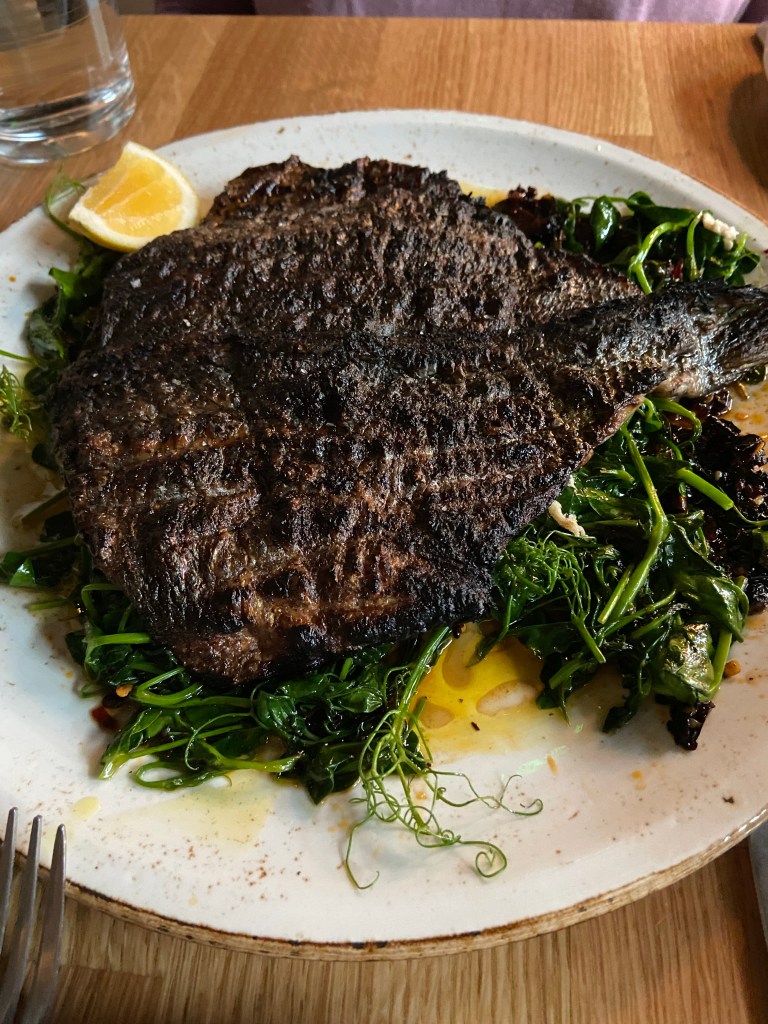 The menu is American style with an emphasis on plates to be shared.The two of us shared grilled asparagus, deep fried bread, turnips, a whole striped bass, extra bread, and dessert.