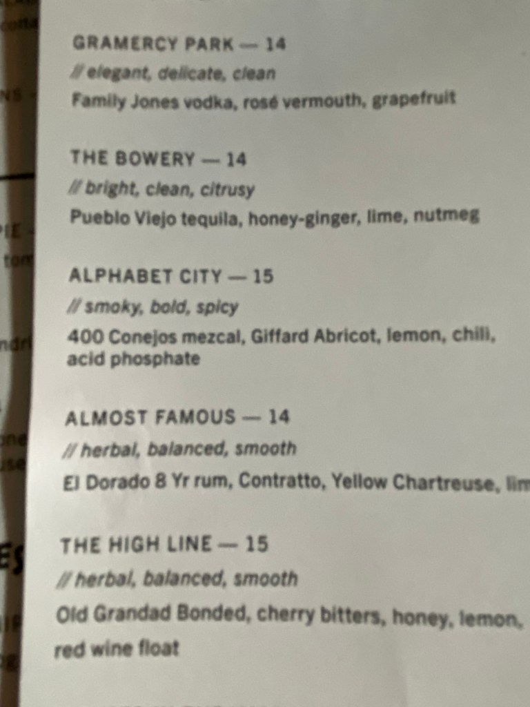 The Greenwich is a new vibrant restaurant with New York City ties. The cocktails are all with names of places in the Big Apple. We started with an Alphabet City cocktail which has Mezcal, lemon, and chili. Delores Tronco, the owner, has ties to both Colorado and NYC. The Head chef, Justin, is a native New Yorker. Once again Mile High Dining was the oldest diner there by years but everybody loved my purple Chuck Taylor converse sneakers.